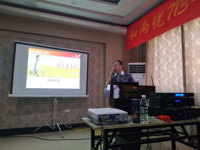 在交流研討會上,劉庚經理為與會的經銷商和農戶詳細介紹了江蘇明天種業的發展歷程和方向,分享了和兩優713的品種特性和配套栽培技術。公司雜交水稻部楊海波經理闡述了公司選育品種的方向,對農戶們在713的肥水管理方面提出了寶貴意見,得到了與會人員的一致贊許!最后,棗陽市植保站張站長和土肥站王站長均大力推薦和兩優713,真可謂“品種好不好,行家來把關!”各地經銷商和農戶代表均對和兩優713的品種表現表示十分滿意,并表示將持續關注明天種業的最新動態,希望未來公司能推出更多更好的品種和配套的技術服務,讓農民做到科學種田,輕松實現豐產豐收!