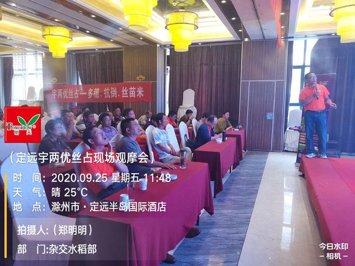 室內(nèi)會議上,丁震副經(jīng)理與大家詳細(xì)分享了宇兩優(yōu)絲占的特征特性,同時與合作伙伴分享了其他區(qū)域的大田表現(xiàn)及田間栽培管理注意事項。宇兩優(yōu)絲占是2020年最新國審品種,審定號20206538,主要特點“多穗、矮桿、絲苗米”。