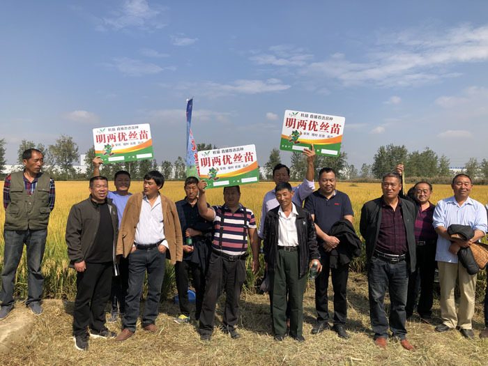 風吹楊柳盡,雨落稻花香。金秋十月,金黃的稻谷隨著秋風翻起金波,豐收在即。公司于10月8日-9日在江蘇省睢寧縣隆重召開明兩優絲苗田間觀摩會議。參加會議有江蘇明天種業科技股份有限公司副總經理王波、總經理助理楊海波及公司代表,睢寧縣明兩優絲苗核心代理商彭奔、各縣市經銷商、種植大戶、育秧合作社代表共計100余人參加會議。