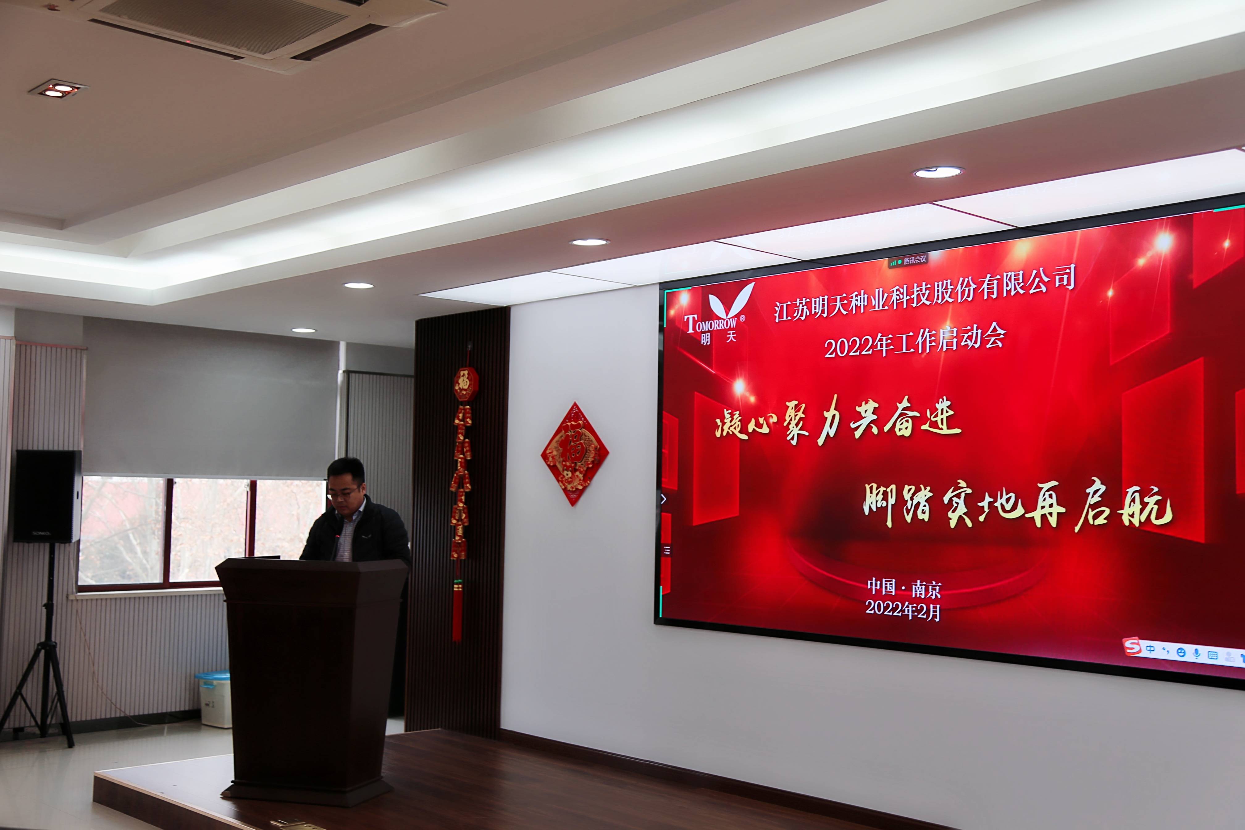 萬物逢春可復蘇,天道酬勤鑄不凡!新年伊始,為淡化節日氛圍,盡快投入工作狀態,2月17日,明天種業在江蘇省農科院糧食所會議室召開了2022年工作啟動大會,會議由副總經理胡玉成主持,嚴輝民總經理作了“凝心聚力共奮進·腳踏實地再起航”的動員報告。公司全體員工、子公司經理層及2021年度先進和優秀員工參加了本次會議。